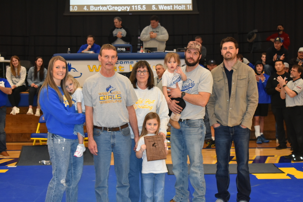 Prior to the finals of today's wrestling invite, long-time Husky wrestling coach Randy Schroeder was honored for his 36 years of coaching at West Holt. Schroeder was awarded with a plaque, and was informed that going forward, the West Holt Boys Wrestling Invite will now be called the "Randy Schroeder Invitational at West Holt." Congratulations, Randy!